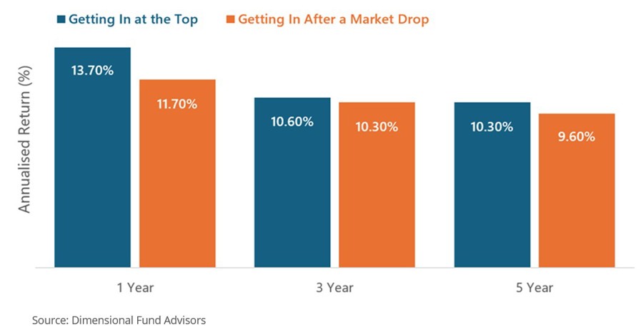 While individual cases may vary, the graph shows that generally getting in, even if it is ‘at the top’, performs better on average compared to waiting for a 10% market drop.